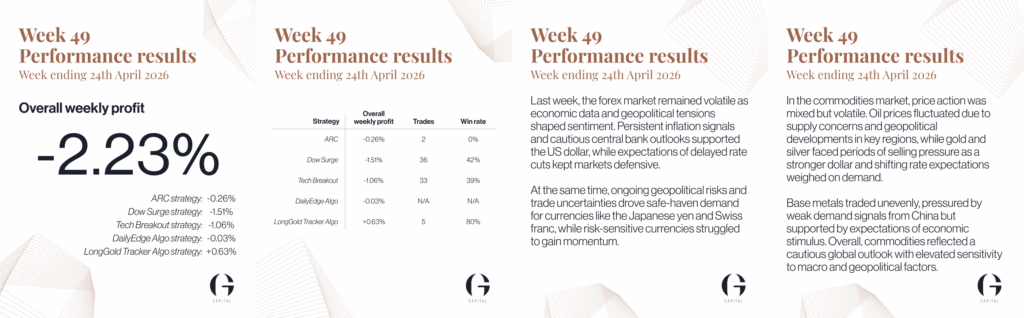 GUILD Capital recorded a total trading return of -2.23%. for the week ending 24th April 2026 across our forex and commodities strategies. Here’s a breakdown of the performance across our active strategies: